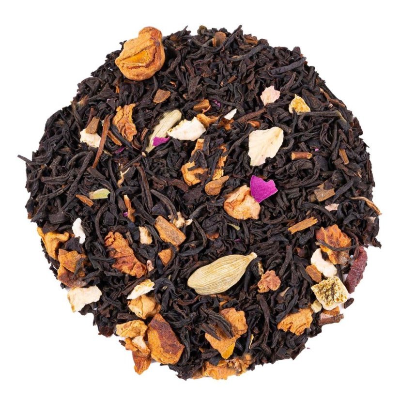 This festive tea blend is based on Assam black tea , originating from South India . Thanks to this, the tea has a naturally full and intense taste , typical of the Assam region, and offers a gentle caffeine boost . Exotic ingredients and traditional Indian tea quality combined with spicy Christmas notes create a pleasantly balanced cup.
